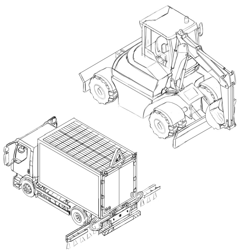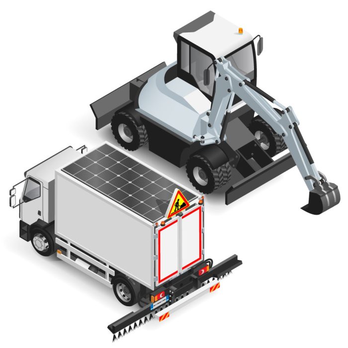 Réalisation d’un camion et d’une pelleteuse en vue isométrique.