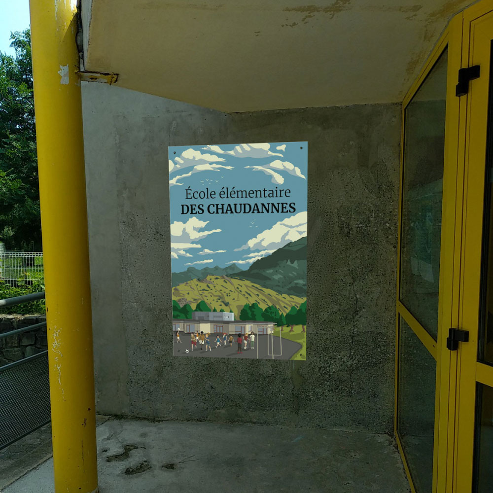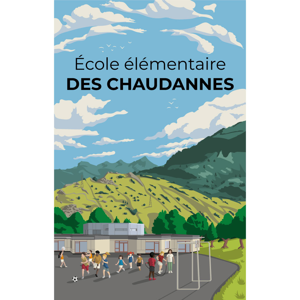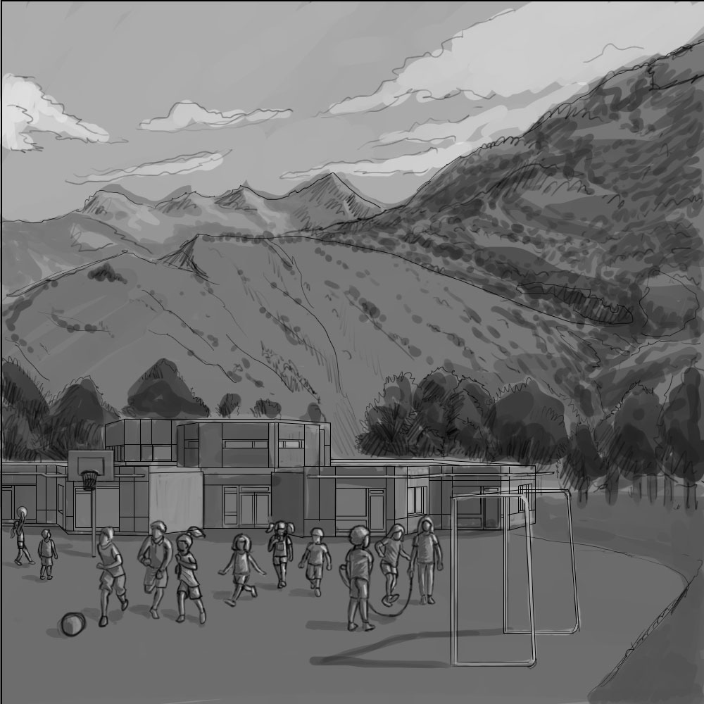 Création d’une illustration personnalisée représentant une vue de la future école à Saint Jean de Maurienne. à l’aide de la réalisation en 3D de la future école, mise en place détaillée de l’école devant une chaine de montagne, représentatif de la région, en plus des enfants qui jouent dans la cour afin de donner vie à ce paysage.